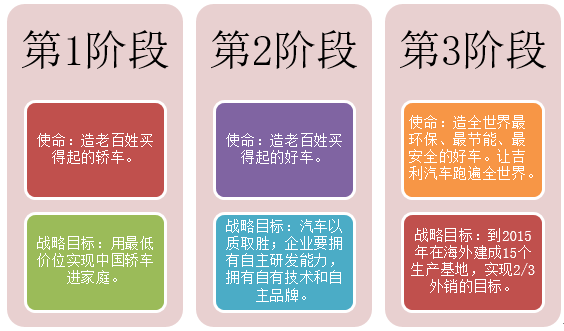 著名管理学家德鲁克认为,各项目标必须从“我们的企业是什么,它将会是什么,它应该是什么”引导出来。它们不是一种抽象,而是行动的承诺,借以实现企业的使命;它们也是一种用以衡量工作成绩的标准。换句话说,目标是企业的基本战略。例如在“我们一定要提供物美价廉的办公用品”“在未来5年,我们要加快发展步伐”“日本丰田汽车秉承精益生产的经营理念”“截至2020年,在远东地区的市场份额要达到23%以上”这几个选择中,按照公司目标应是具化、量化、可测度的要求,“截至2020年,在远东地区的市场份额要达到23%以上”是公司目标的准确表述。以吉利汽车集团为例:
